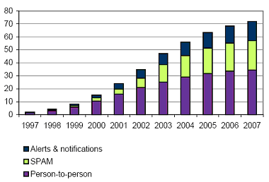 και την επίλυση του πραγματικού προβλήματος. ΤΟ ΜΕΛΛΟΝ ΤΟΥ SPAM Η μέχρι σήμερα πορεία του φαινομένου δείχνει ότι το spam ετησίως αυξάνει και καταλαμβάνει ένα ιδιαίτερα μεγάλο ποσοστό της σημερινής ηλεκτρονικής αλληλογραφίας που κυμαίνεται από 20% έως και 70% σε κάποιες περιπτώσεις. Όσον αφορά το μέλλον του spam σύμφωνα με έρευνα της IDC η οποία αναπαριστάτε στο παρακάτω γράφημα το spam θα αυξάνεται σταδιακά αναλογικά με τον συνολικό αριθμό της ηλεκτρονικής αλληλογραφίας. Αριθμός e-mails ανά ημέρα σε παγκόσμιο